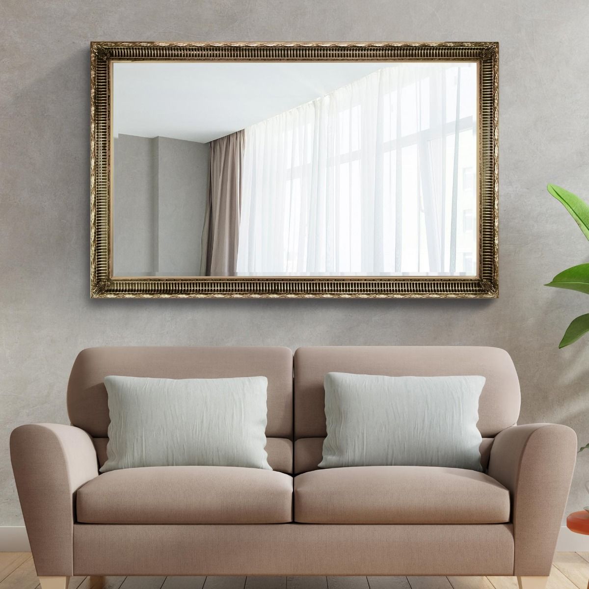 This extravagant Gold wall mirror will add style to any room from the living room to a hallway. This has a premium bevelled glass size of 5ft x 3ft 152cm x 91cm and has an overall size of 5ft7x 3ft7 172cm x 111cm. This mirror comes with fixing loops attached to hang directly to screws in the wall. Do not use string wire or chain.